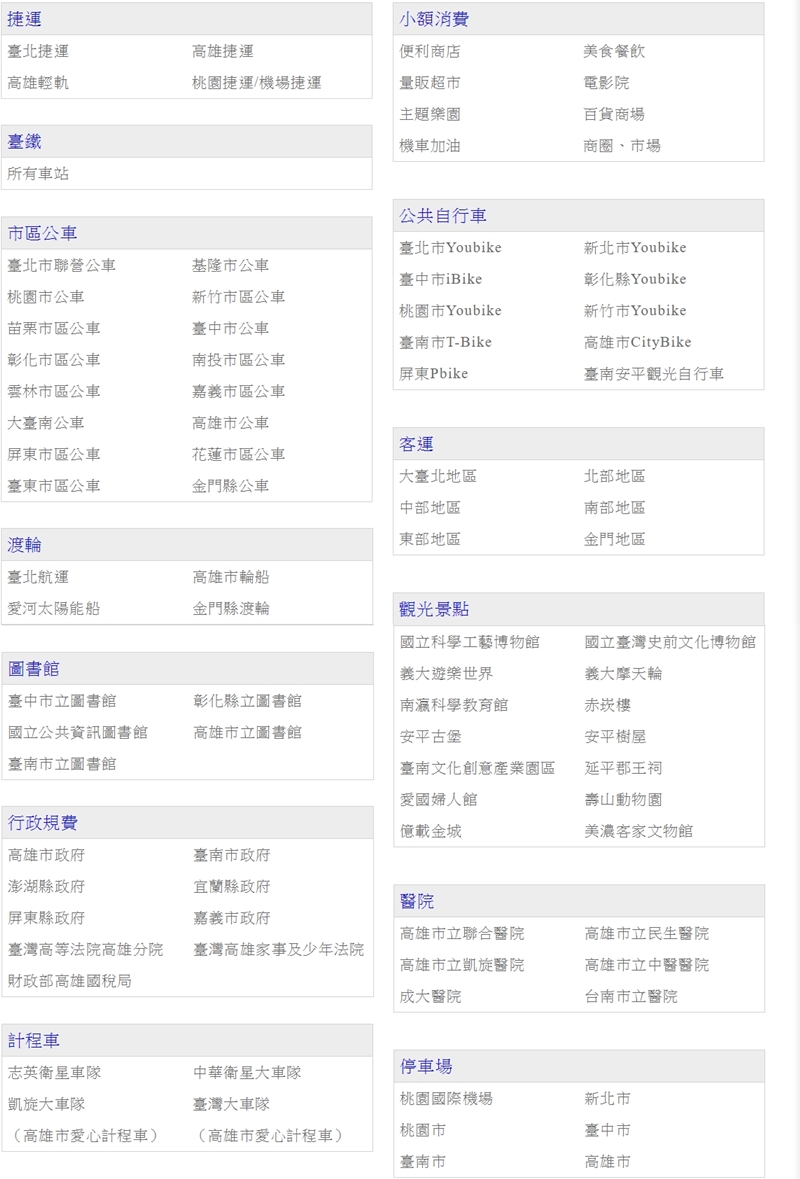 - 公益團體:包括財團法人中華民國腦性麻痺協會等五個機構,都可以用悠遊卡扣款。