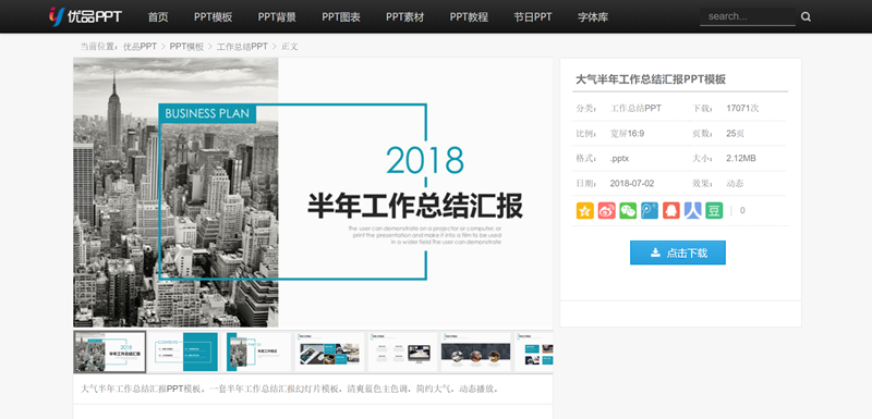 阿湯就挑頂端的幾個分類來介紹,首先是大家最愛的、可一鍵套用的模板,像這款都市風的工作匯報,可以點圖片進去看細節,右邊也有上傳時間、檔案大小、格式、效果,目前已有 17071 次下載。