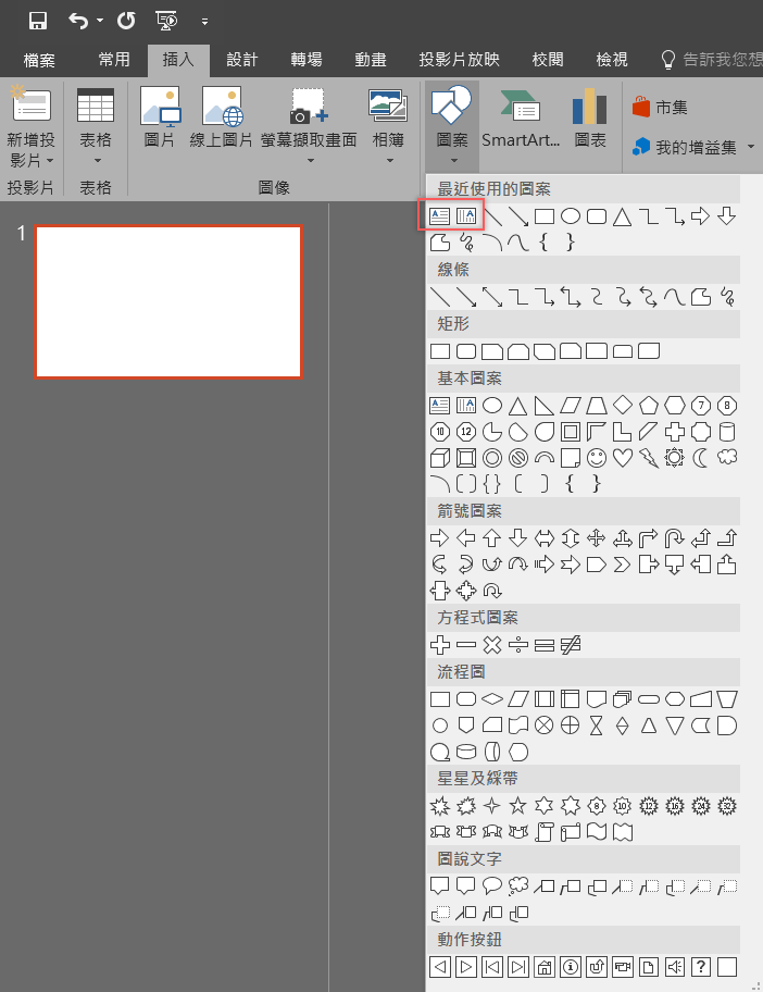 開啟一張空白投影片後,到插入 → 圖案 → 文字方塊,選擇要直書還是橫書。