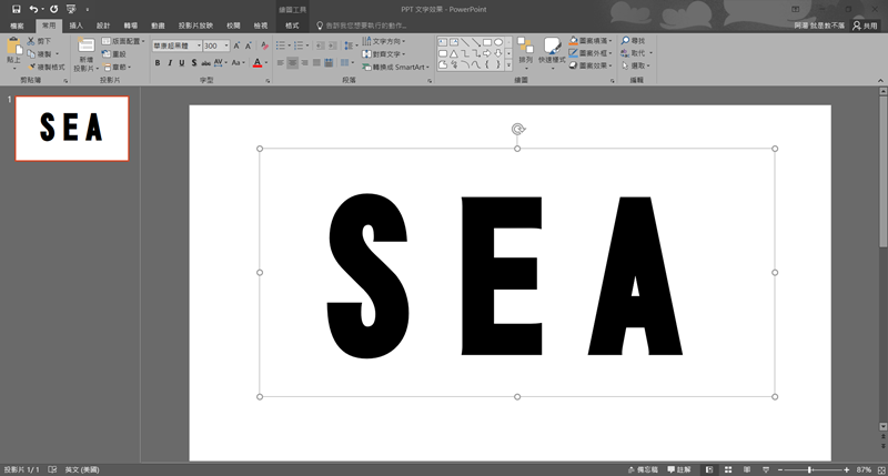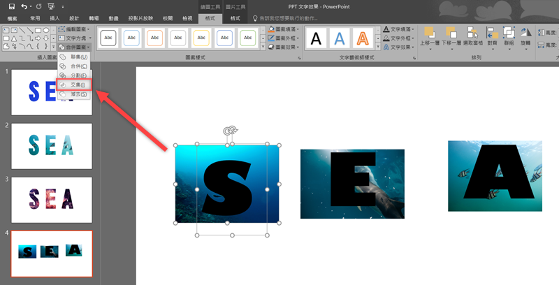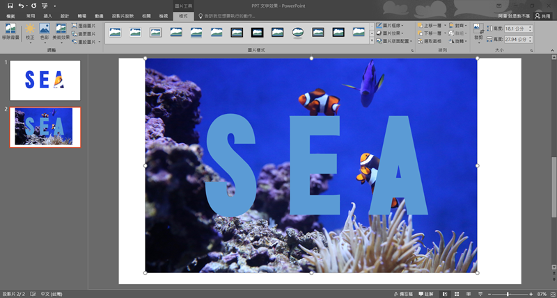第三種方式,插入圖片並放到文字底下,這時候就可以任意移動圖片,字體遮蓋的部分就是會顯示的部分,按住 Shift 同時選取文字與圖片。