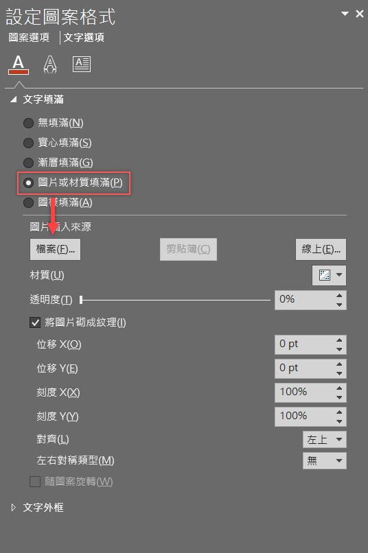 切換到文字選項,點選「圖片或材質填滿」後插入檔案。