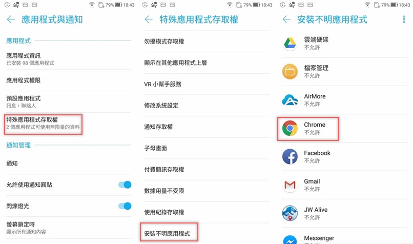 首先是阿湯之前教過的,使用 Chrome 瀏覽器並開啟限制,這邊再示範一次,應用程式與通知→特殊應用程式存取權 → 安裝不明應用程式,再選擇 Chrome。