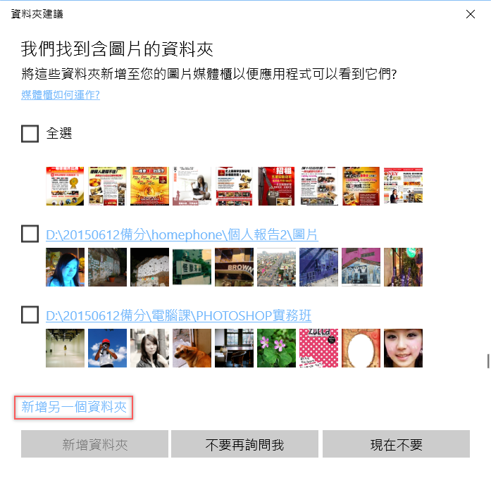 程式會跳出建議,通常不會讀取到你剛剛才建的資料夾,所以要再按一次「新增另一個資料夾」。