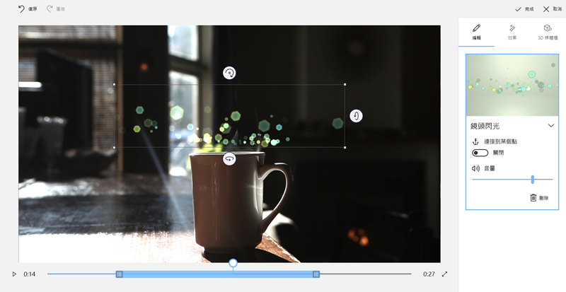 比較有趣的是 3D 效果這項,選擇想呈現的效果後放到適合的位置,例如鏡頭閃光,置入後阿湯將它放在杯子上,這效果是含聲音的,可以調整音量,不想用的話也能刪除。