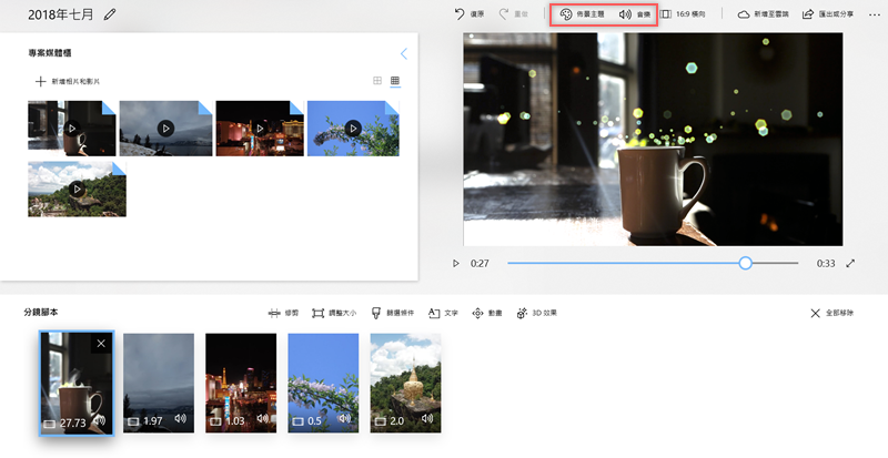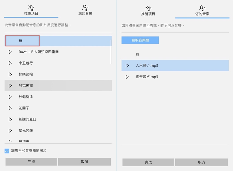 將預設音樂改成「無」,然後可以新增自己的音樂檔,要注意的是如果將這個專案新增到雲端,是不會包含音樂的。