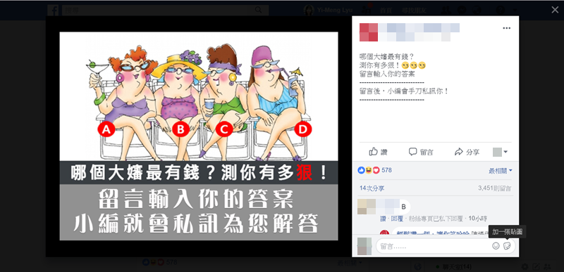 使用留言或私訊,心理測驗型有分純選項(ABCD),或是請大家回答項目內容的,這類型是最近幾個月最常見的,而且大家應該會發現會做心理測驗的就那幾個朋友,是有多少好奇心讓你一做再做幫人家衝人氣?這類通常都是一些沒什麼內容的粉專,或是購物型,回答後再給你網站連結請你點閱的。