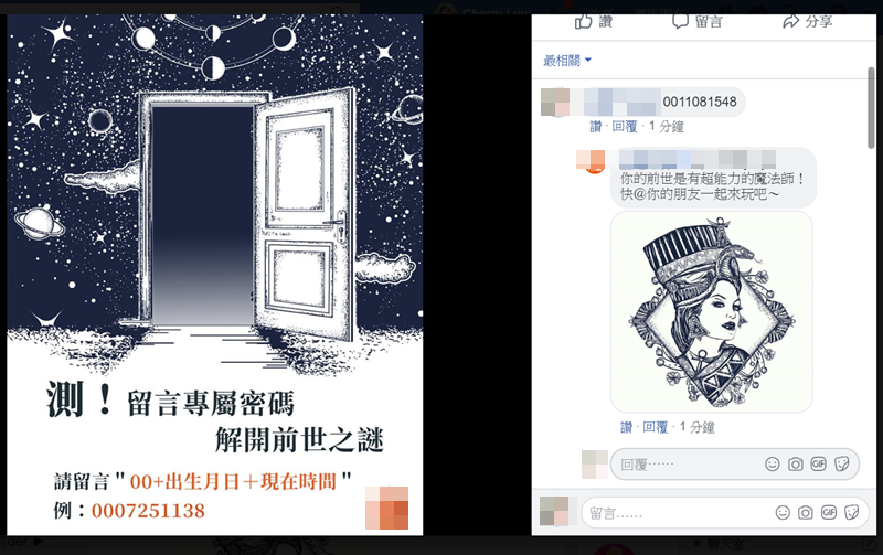 心理測驗,還要你生日(甚至電話)的,也許小編只是製造話題並不會拿這些數字去幹嘛,但你怎們知道呢?更何況留言是公開的,陌生人也能知道你的生日,如果阿湯是個廣告商,一定會偷偷去蒐集這些帳號的生日,然後再投放適當的廣告,像是生日禮、星座分析等。