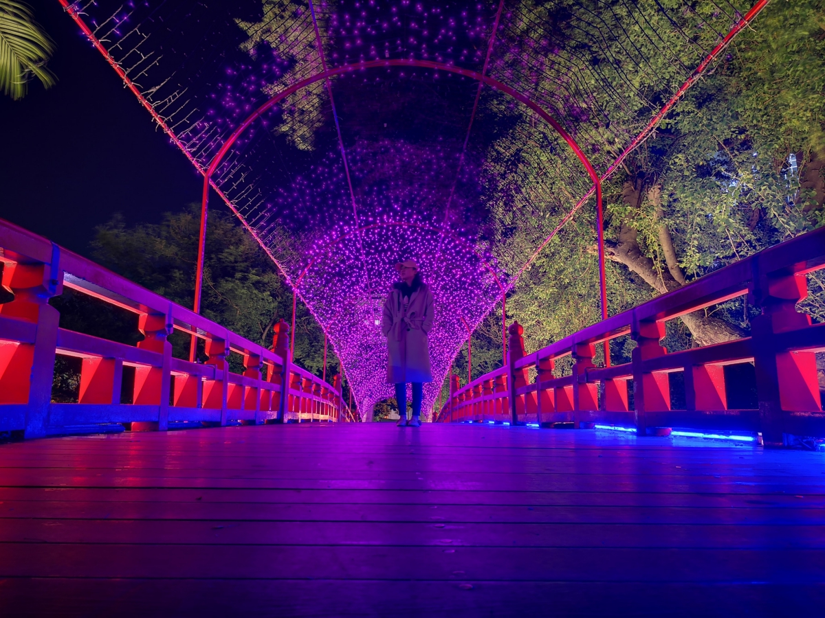 連接湖心亭還有一座紅色的橋,搭配紫色的燈光拍攝起來很有神秘感啊,台中公園對阿湯來說是個處處都有夜景可以拍攝的公園,也難怪我已經來拍過很多次了。