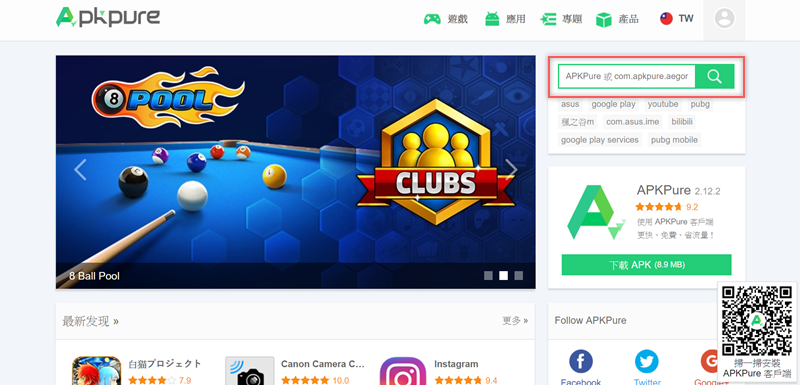 APP),不管下載到電腦或手機都很方便,這篇的「APKPure」也是一樣有兩種版本,可以輸入關鍵字搜尋、查看熱門的應用程式或遊戲排行,並直接點擊圖示下載,手機裡現有的 APP 也能一併管理與更新,重要的是提供 Google Play 沒有的歷史版本,可以找到舊版來安裝。