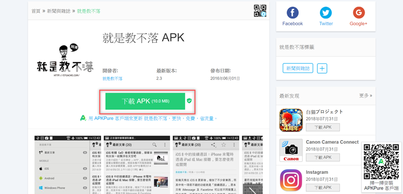跟 Play 商店類似,版本、發布日期、縮圖與簡介等基本資訊都有,按中間的下載 APK 就會自動開始,不過有點慢才 10MB 就花大概 30 秒,與網速也有關係。