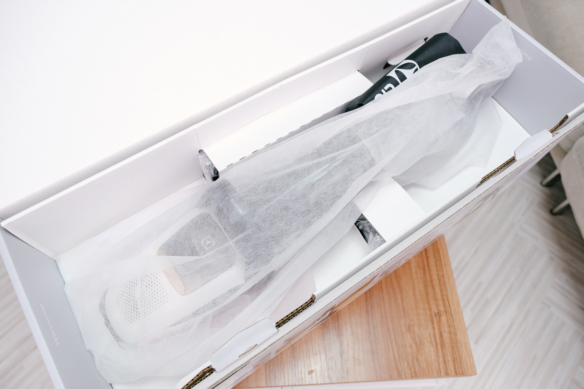 阿湯在收到吸塵器的時候,其實剛好當天就前往深圳出差去了,所以忍耐了四天回來連行季箱都還沒拿上樓,就先直奔管理室領取,迫不及待的想把玩伊萊克斯這款有著全新滑移設計的無線吸塵器,首先可以看到在外箱的設計上就可以看到,握把開孔是採用對角設計,因為吸塵器是長型的箱子,不論開在窄的二側或長的二側都不好拿,如果設計提把又很容易斷掉,像這樣的對角握把開孔就非常好搬動(如果家中有直立式洗衣機的朋友也可以注意一下,很多直立式洗衣機也是設計成對角握把方便搬運,重心更穩定)。