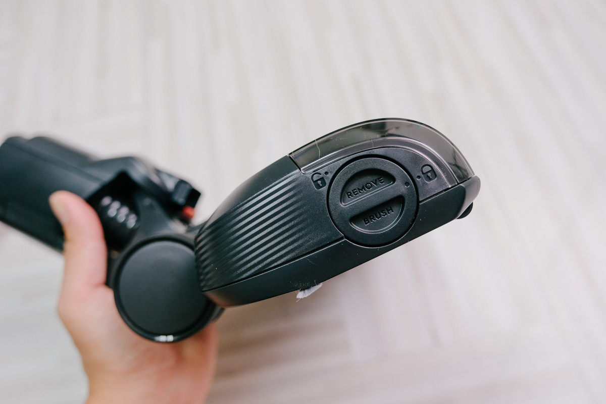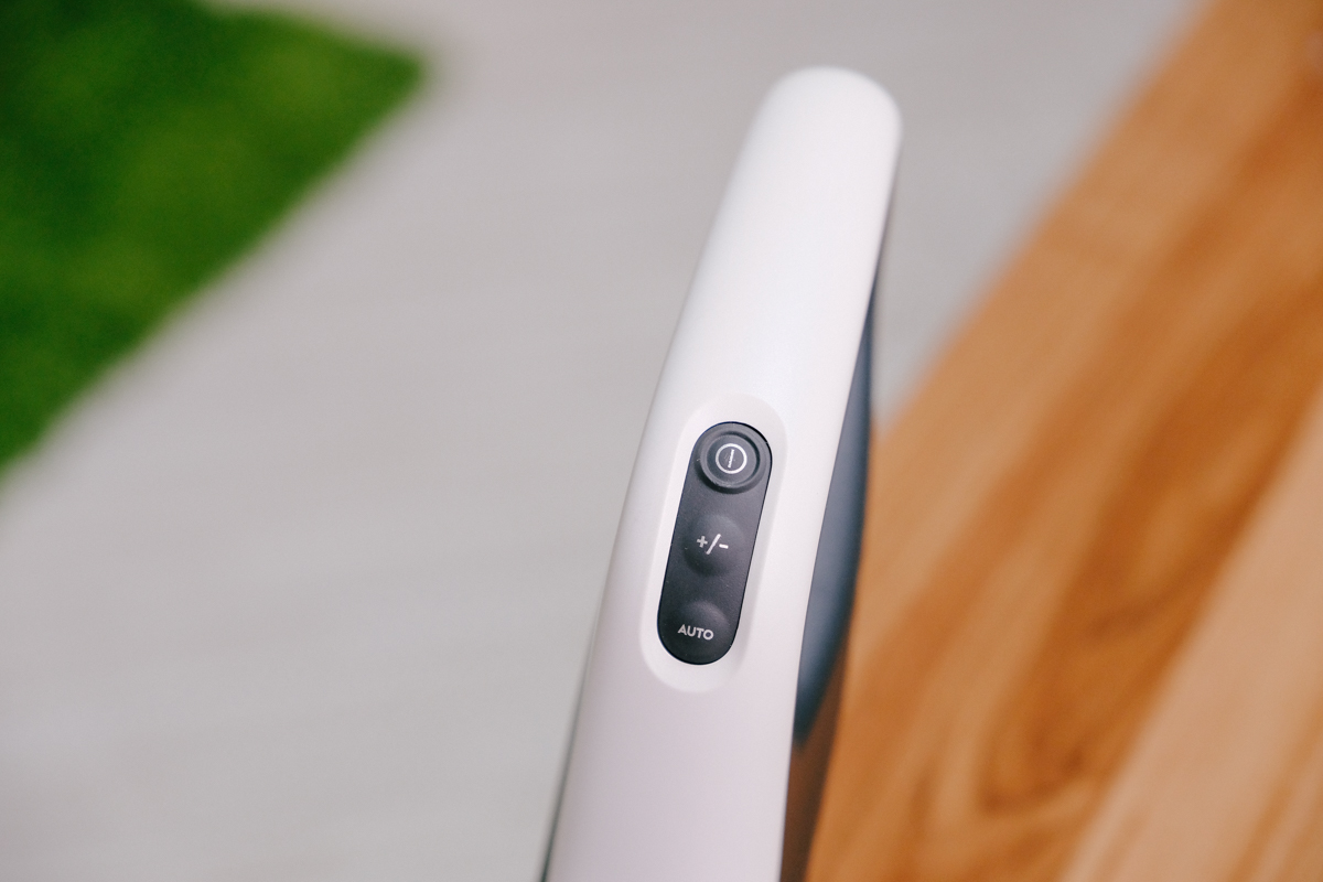 在手把上一共有三個控制開關,分別是電源、切換吸力段數以及 Auto 模式,阿湯認為開關設計成不用一直按壓著開關使用是最省力的。