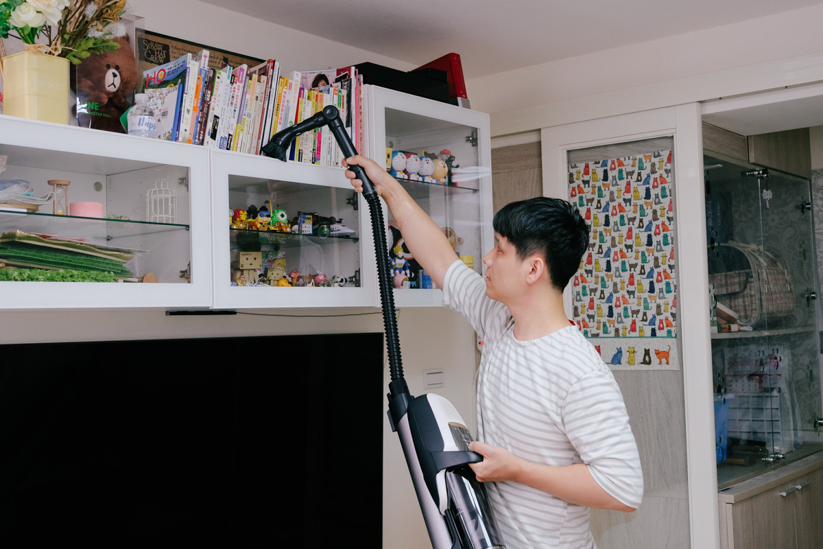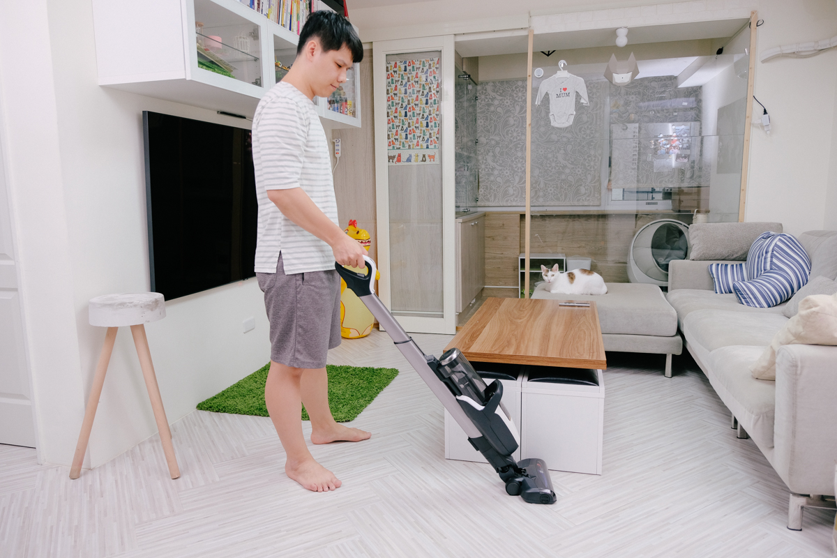 各項設計上其實運用在各種清掃環境真的蠻便利的,以女性使用來說,清掃地面真的相當的省力,可以說是讓你更優雅的打掃,而吸塵器機身本身在手持時其實算是有點重量,所以阿湯會認為這款吸塵器以長時間打掃來說,會更適合男性使用,當然家中的分工也可以是由女生來打掃地面的部份,而需要提著吸塵器到處走的部份就交給男生來處理,雖然提著其實重量並不是到女生會接受不了,只是當打掃時間長的話,對女生來說還是會有一點的吃力感,所以我們還是要當個居家好男人,一肩扛起各種家電(冰箱除外,會壓死人)來包辦大小事,加上老婆現在身懷湯包(他的小名),當然更是要扛起來啊!