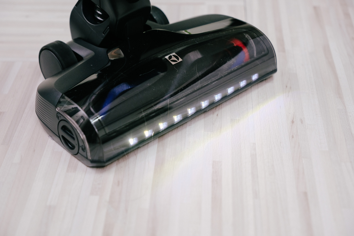 首先來介紹一下這最主要的吸頭,最特別的設計之一就是在前方加上了 10 顆 LED 前置燈源,可以更清楚的照亮地上的髒汙、灰塵等,或者像伸入沙發下時,也能發揮超大的功用,照亮更多平常你看不清楚及看不到的地方。