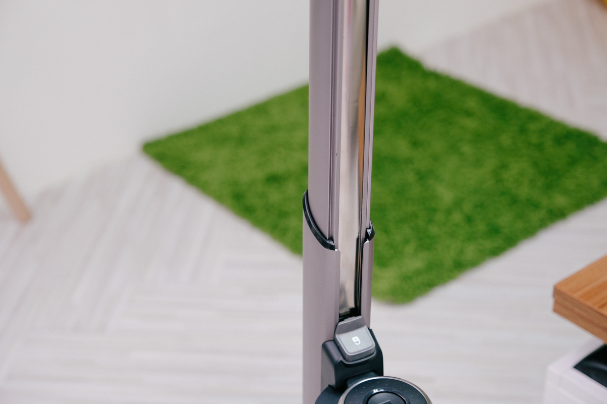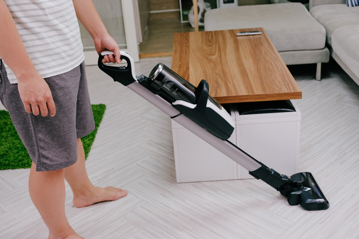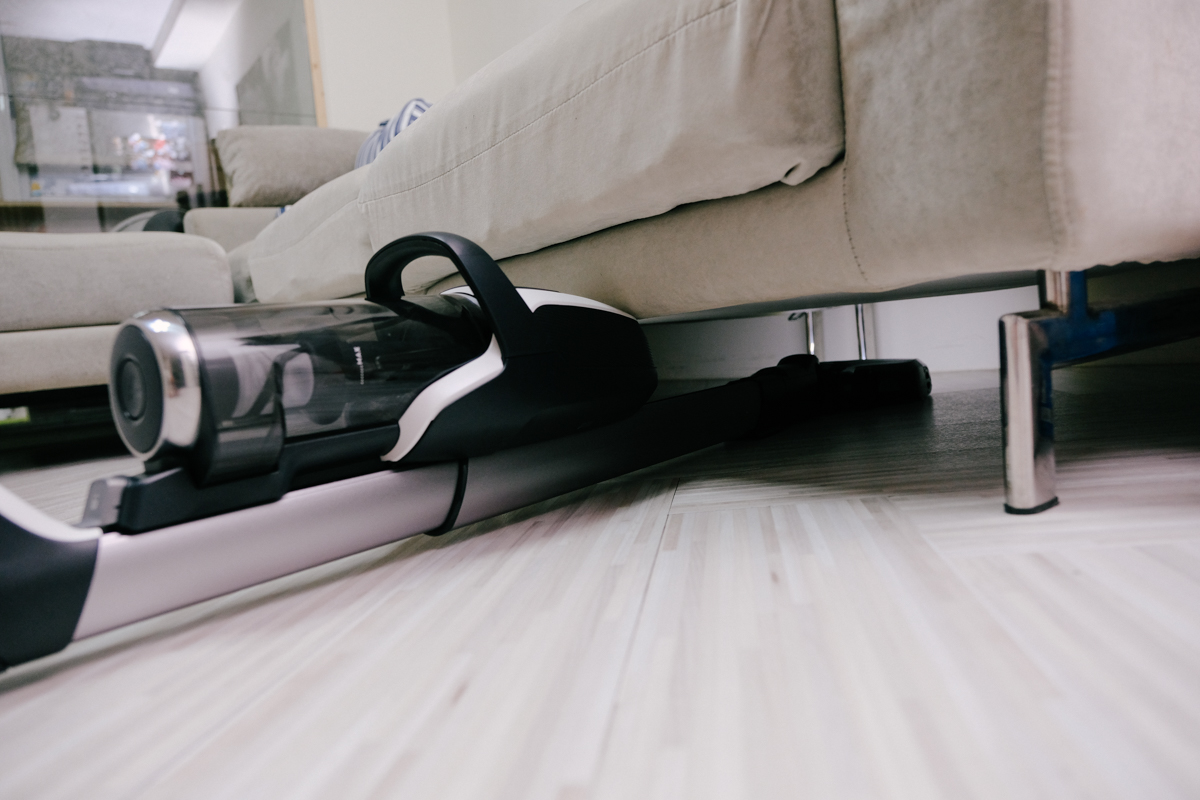 第一就是可以伸入沙發底下進行清潔,吸頭與機身基本上是可以近乎貼平地面來使用的,伸長後可以伸入最深 70 公分的沙發底下。