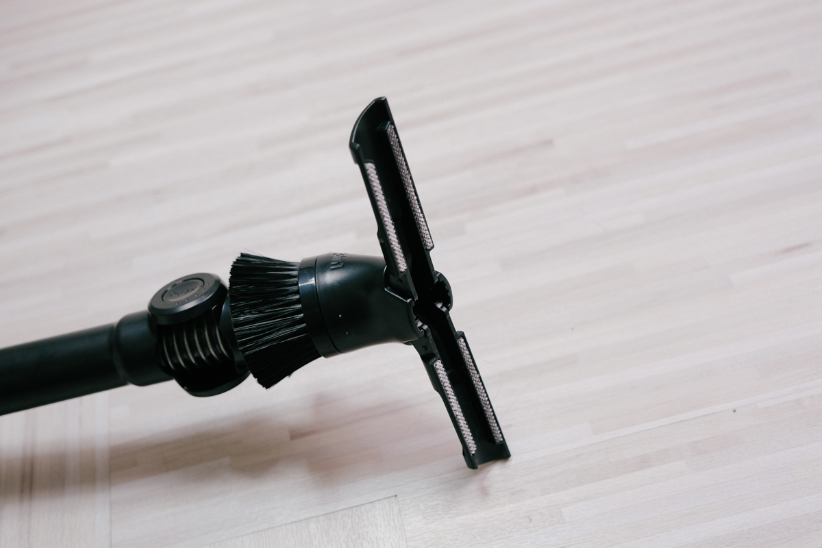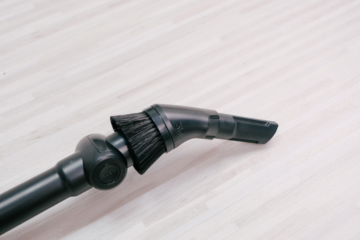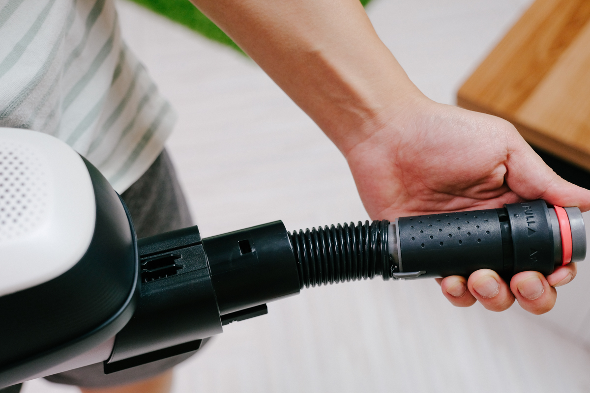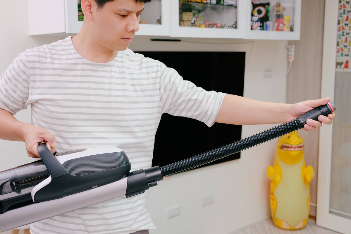 除了滑移設計之外,另一個最便利的設計就是將這彈性軟管藏在裝置吸頭的地方,讓配件結合在吸塵器上,可以減少一個配件收納的問題,而且真的很好用。