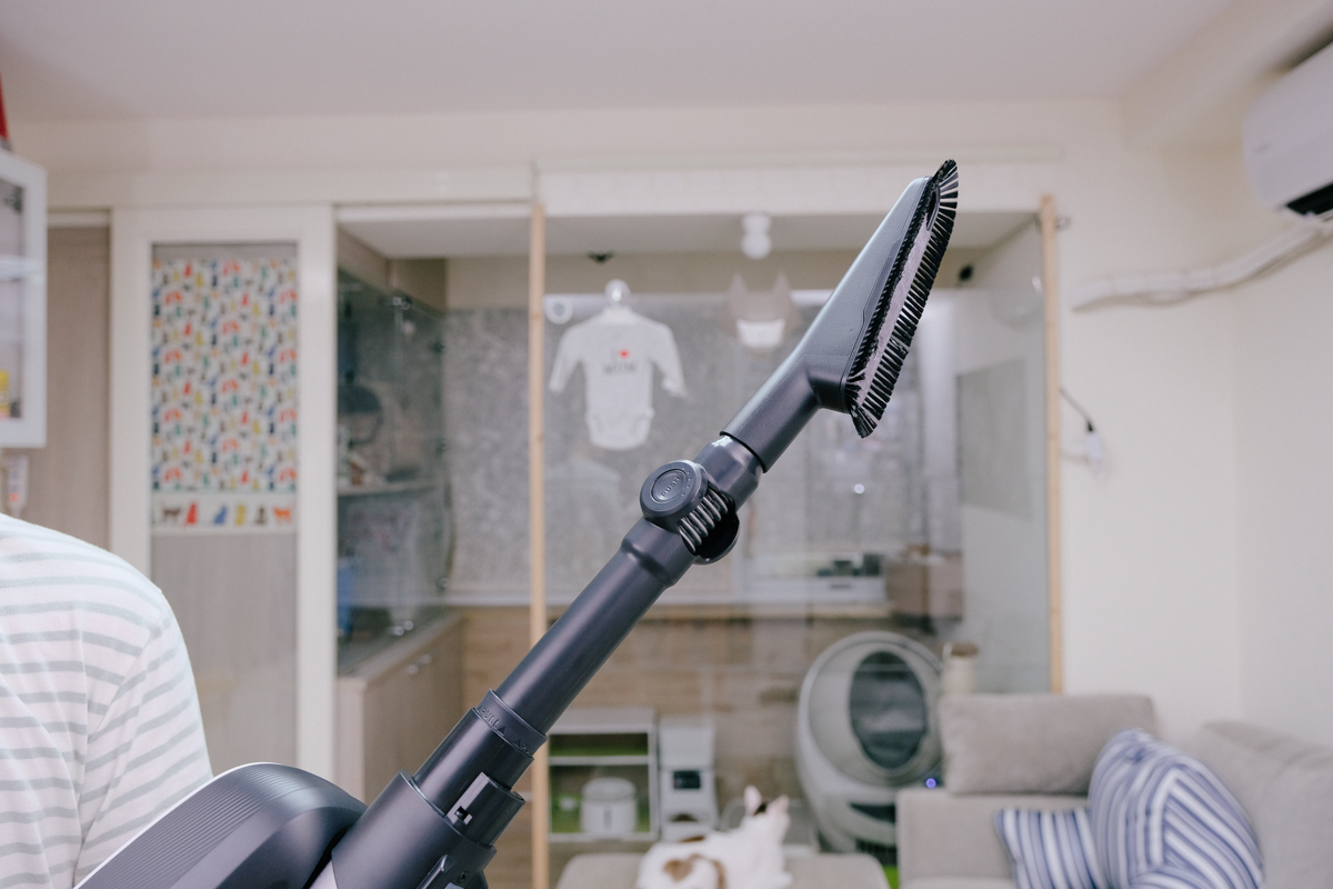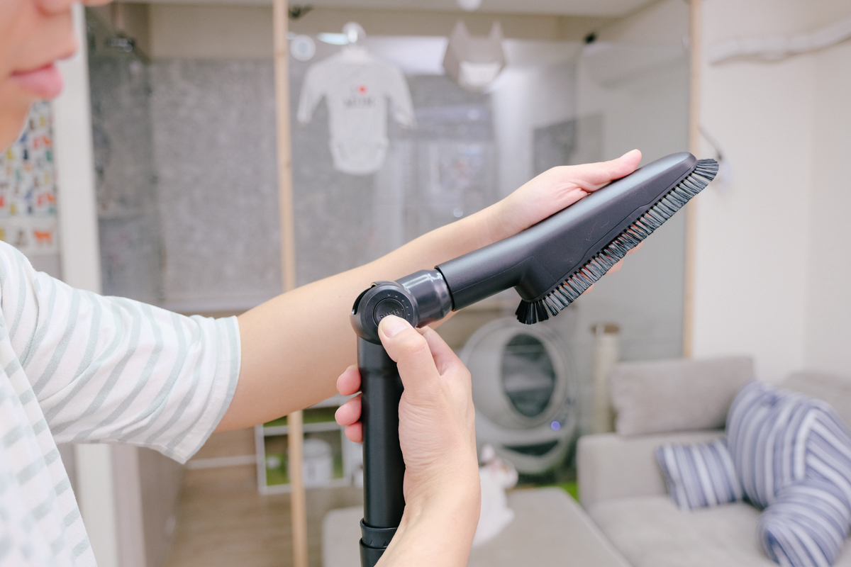以我家的貓屋來說,這窄吸頭就有著莫大的功用,因為貓毛跟細砂很多,如果是用毛刷吸頭會有一堆清不完的貓毛,所以就可以用這個吸頭做第一輪的清潔,再搭配其他吸頭來收尾。