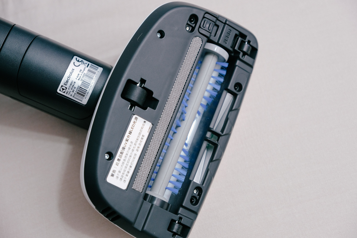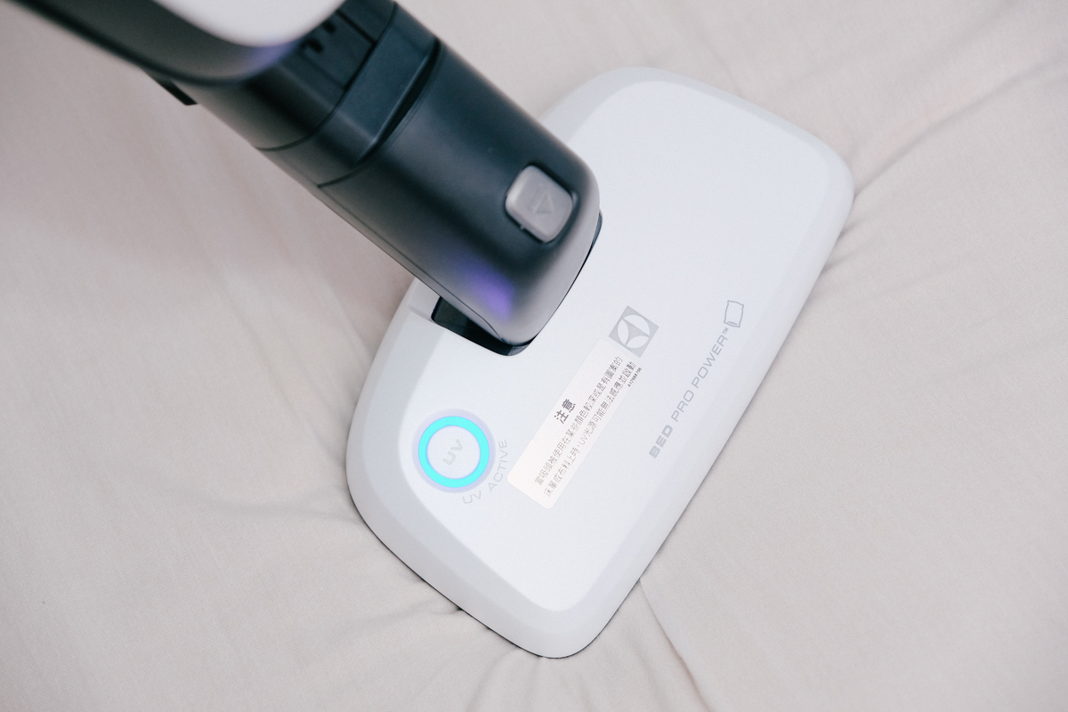 最後要來分享的吸頭就是這個對過敏兒很重要的 UV 床墊電動吸頭,可以看到在吸頭上還有個 UV 開關,當打開時吸頭就會啟用紫外線 UV 光,用來殺死細菌跟塵蟎使用。