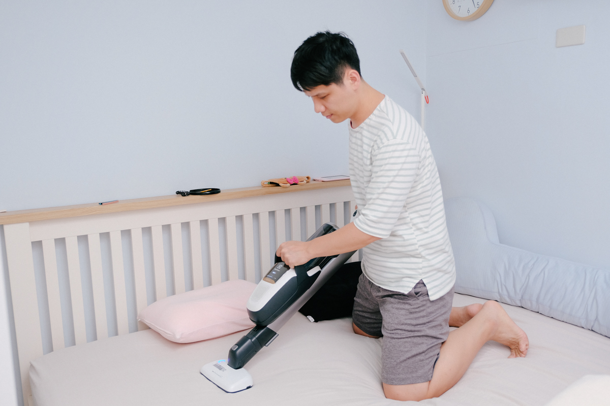 轉換成手持模式來吸床墊,老實說因為吸塵器身長較長再加上有握把,不用再像以前那麼的彎腰怕腰閃到(老了,嘆)。