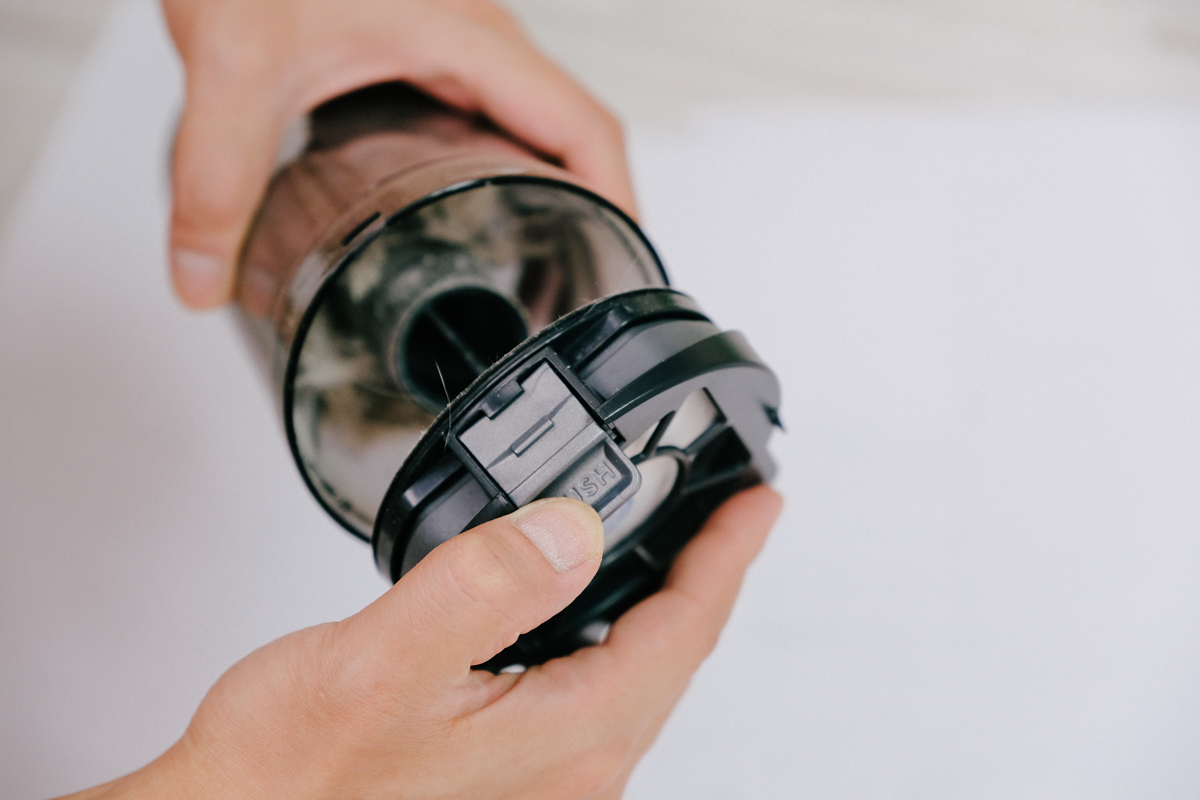 在打掃完家裡千百回後,當然就到清理集塵盒的時候啦,取出集塵盒的方式阿湯同樣認為也設計的很符合人體工學,大多無線吸塵器的集塵盒都是和機體合在一起,無法單獨取出,因此每次要倒垃圾時就顯的稍微笨重,而伊萊克斯這款 PURE F9 無線吸塵器則是只要按壓一下就可以輕鬆取出集塵盒。