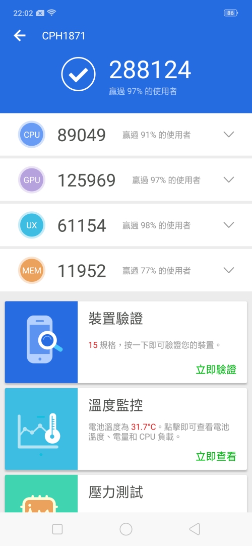 安兔兔跑分測試的部份,由於搭配高通目前最頂規的 S845,分數來到近 29 萬,明年應該就是要突破 30 萬大關了,手機效能真的是發展沒有極限啊!以近期同樣是採用高通 S845 處理器的旗艦機型來看,OPPO Find X 的分數算是採用 S845 的佼佼者了。