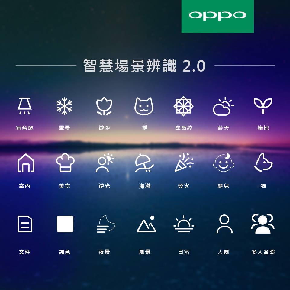 在自動模式下,OPPO Find X 將 AI 智慧場景辨識功能提升至 2.0 版,場景最多可辨識至 21 種,依據環境場景的不同,自動切換最佳的拍攝模式、參數。