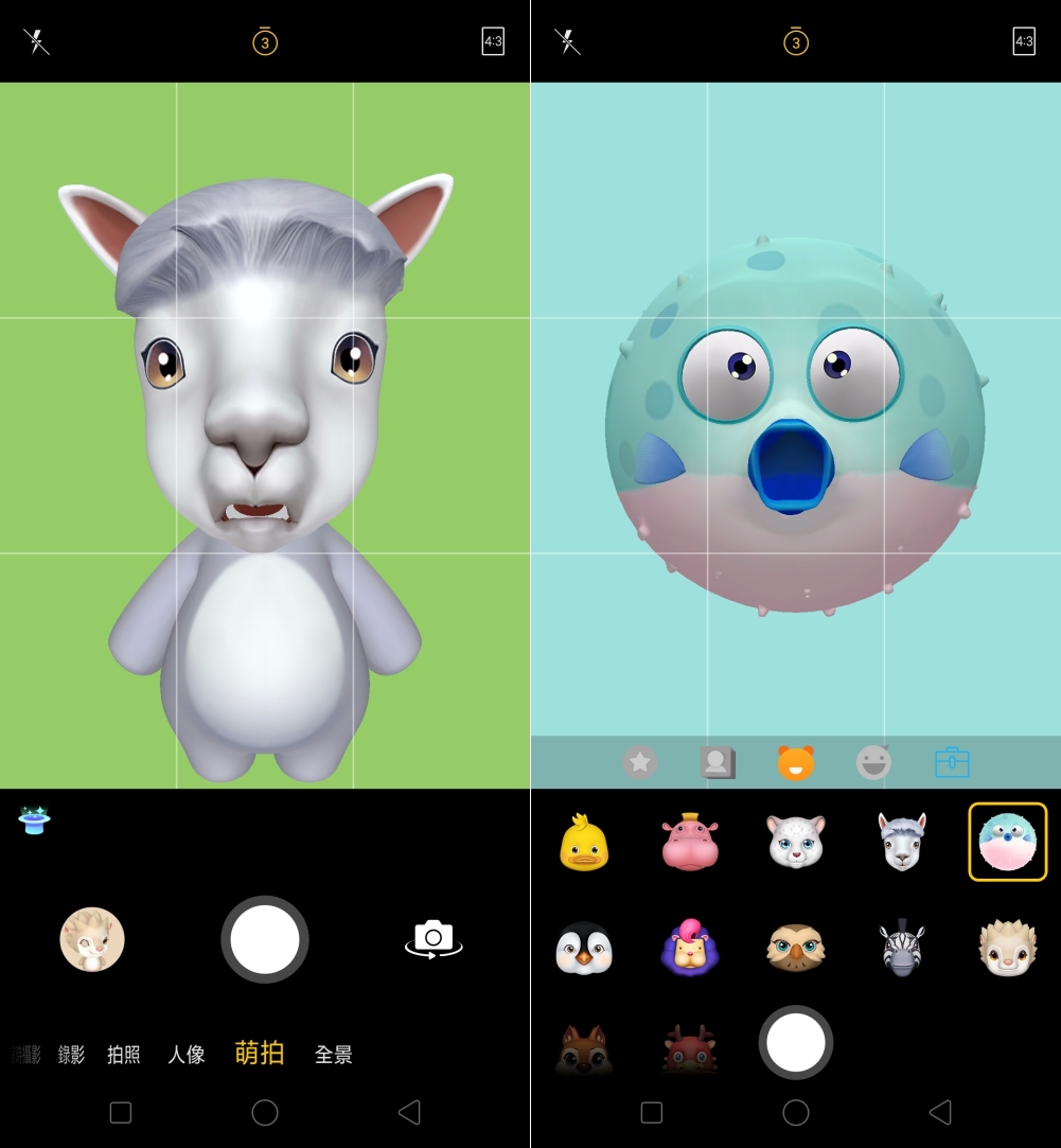 萌拍中最特別的就是 3D 拍攝功能,內建有很多動物及角色讓你選擇,然後只要將鏡頭對著自己,做的任何表情,像是眨眼、扁嘴、嘟嘴等,都會跟你進行同步,按下快門後一樣可以儲存照片來使用。