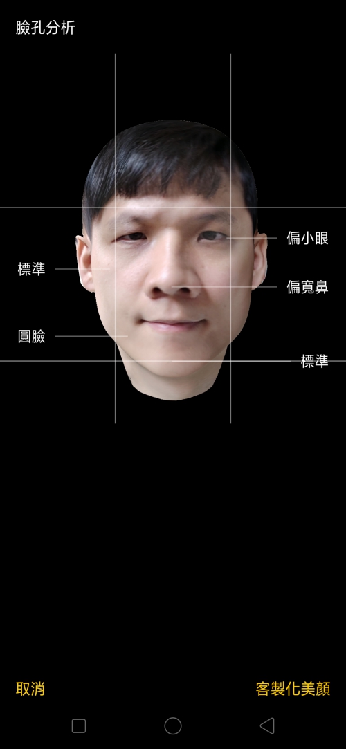 掃描出來後會開始跟你說實話,比如嗆阿湯是小眼睛、寬鼻子以及圓嘟嘟的臉,讓你接受現實(誤),其實不是真的要嗆你啦,是透過這樣的臉孔分析,建立數據後,未來透過 3D 智慧美顏功能自拍時,會自動幫你調校到一個最佳的美顏效果。