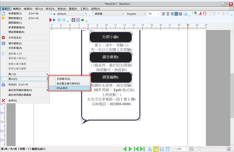 完成後記得先儲存,再選擇要匯出的樣式,阿湯是選用 Epub 的電子書格式。