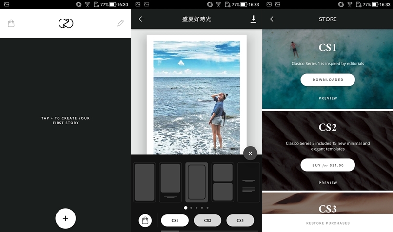 開啟後按下方的+選擇模板,其中 CS1 是免費使用,共 25 款,CS2、CS3 則要付費,挑個喜歡的版型後匯入照片。