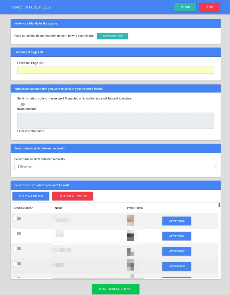 實際試了幾個功能,首先是一次邀請多人對粉絲專頁按讚,點擊選項後會讀取你的臉書資料,帶出你的朋友名單,這時就可以貼上粉絲團網址、加入備註、每個請求之間的時間間隔,選取朋友後一次發送邀請。