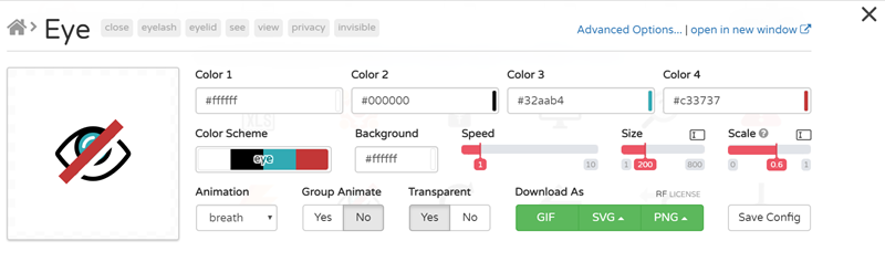 隨便選個眼睛被遮住的範例好了,光顏色部分就可分別自訂四種配色、更改背景色,還有能使用自製調色版或色彩主題。