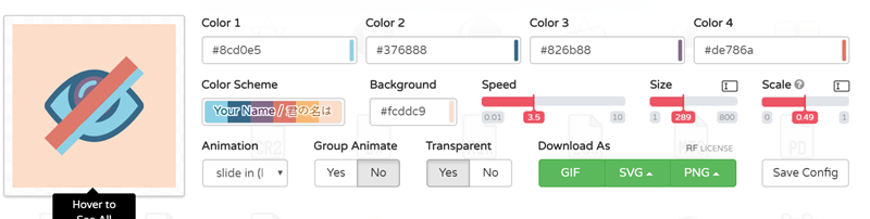 阿湯就改成用「你的名字」色版、滑入動作,再調整速度、尺寸、比例等細節,完成後選擇要下載成 GIF、SVG、PNG 等格式,或先儲存個人配置。