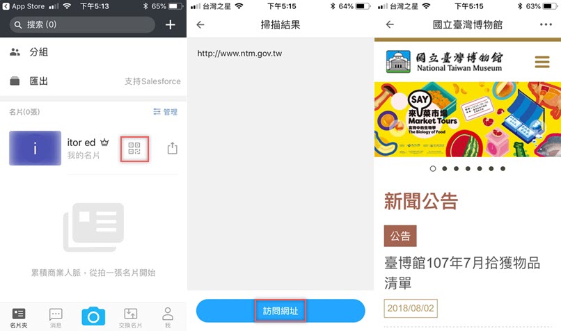 使用前須註冊或用社群帳號登入,進來後先試試看用二維碼掃描名片,馬上辨識出來並可從連結訪問網址。