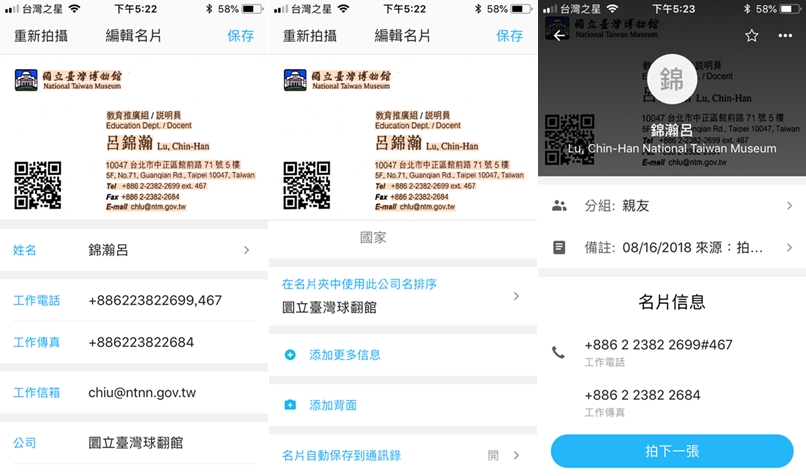 用拍照來新增名片,對準後馬上自動拍攝,速度快到阿湯來不及截圖,便自動辨識內容,基本中英文和數字都沒問題,雖然筆畫較多的字容易讀錯,但點進去修改就好,還能添加背面或其他信息。