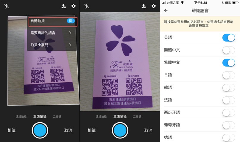 預設自動拍攝雖然速度快,但拍完後不能再做裁剪等編輯,拍了幾次不滿意可以從右上角關閉自動拍攝,可順便設定需要辨識的語言。