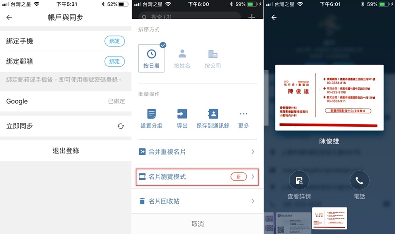 帳戶同步也是一定要的,選擇要綁手機或信箱來同步資料,管理起來就很方便不用擔心一換手機就要重掃,另外還有批量操作和合併重複名片等功能,也能使用瀏覽模式來翻閱檔案,確認詳情或直接打電話。