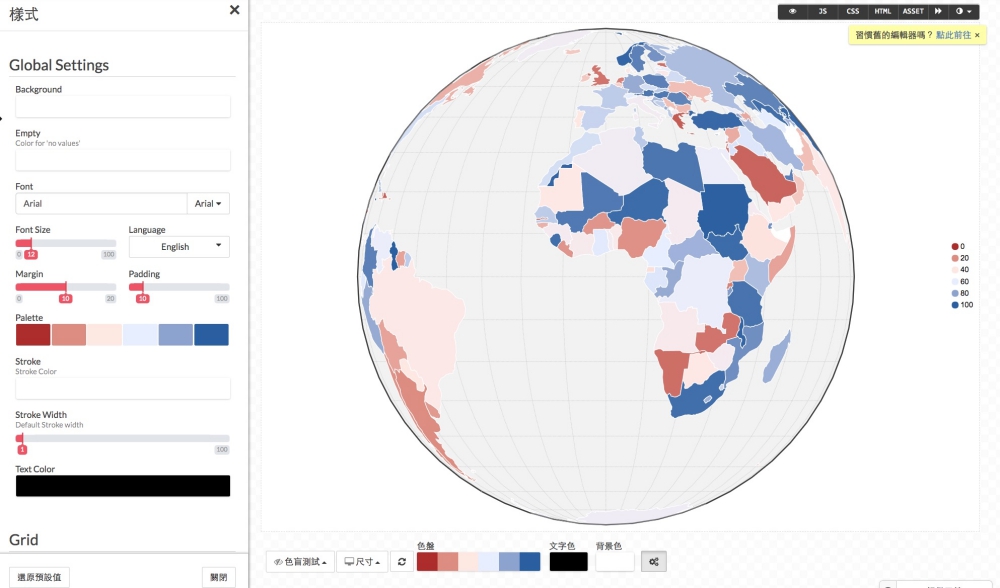 還有像這種國家分佈圖也有,大家可以到首頁去瀏覽看看還有哪些資料圖表,而且都非常好看,需要做資料分析的朋友應該是對這樣的工具有莫大的需求吧。