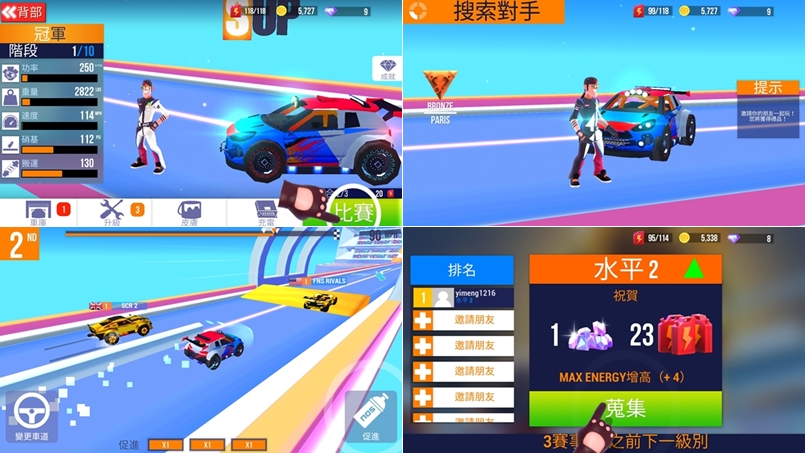 一開始有新手教程,然後就能透過配對開始遊戲,用手指一直向前跑即可,途中有金幣和加速器,玩法簡單畫面也蠻好看的,除了可豐富經驗升級、強化裝備等,還能自己創建軌道、更改曲目。