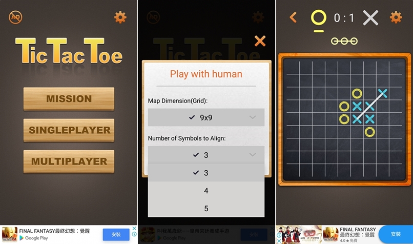常稱為井字遊戲或圈圈叉叉,可以用基礎版也有加強版的到 9*9,要多少條線算贏也能設定,自己跟系統玩或跟朋友配對都可以,花多少時間就看各位囉。