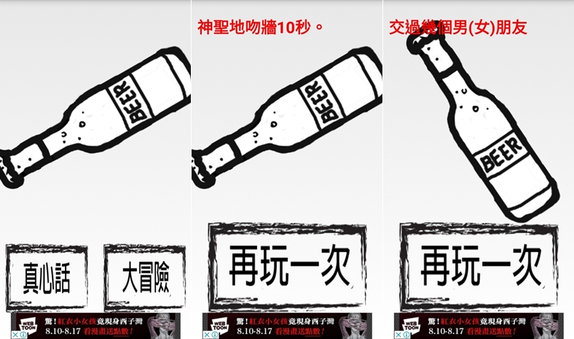 這款本來就是多人遊戲,一個人玩也很空虛吧,就是虛擬酒瓶轉到誰就輪到誰,再選擇真心話或大冒險,內建題庫豐富,也可自訂更奇怪的題目。