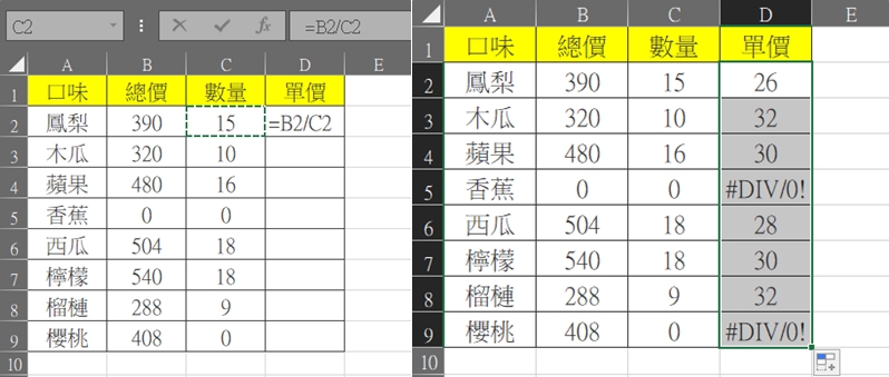 常常用來檢視除數不能為 0,以下圖為例,單價等於 B2/C2,往下複製後發現出現兩格「#DIV/0!」表示公式錯誤。