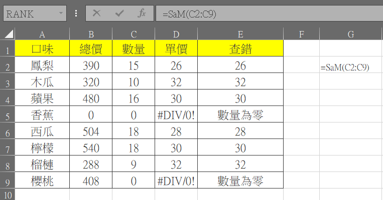 表示如果 D2:D9(單價)是正確的值就顯示出來,否則就顯示「數量為零」,往下複製就完成除錯。