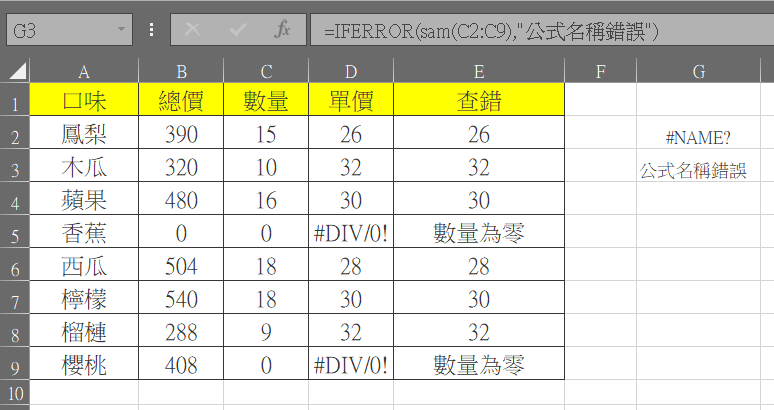 =IFERROR(sam(C2:C9),"公式名稱錯誤")