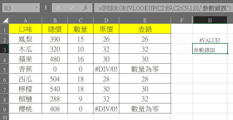 =IFERROR(VLOOKUP(C2:E9,C2:C9,1,0),"參數錯誤")