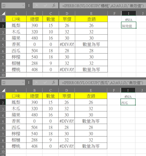 因為沒有楊桃所以會出現「無效值」,但如果將公式裡的楊桃改西瓜,在範圍中是有西瓜的,表示正確,就會顯示正確值「西瓜」。