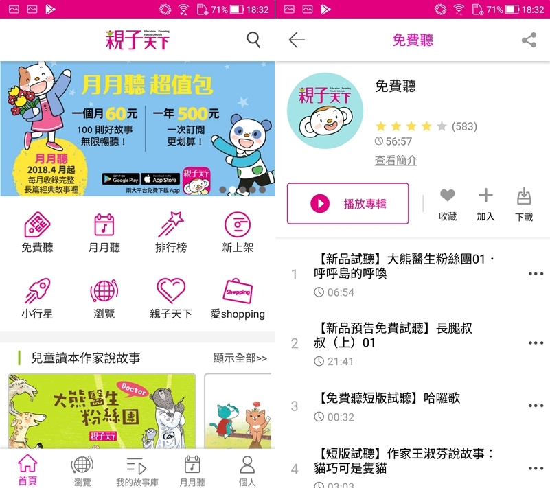 雖然數量很多,目前超過 90 張專輯,1000 則音頻,但要靠訂閱才能時常收到更新內容,如果本身有訂親子天下雜誌的話優惠更多,大家可以先試聽免費的內容再考慮看看,點進去選擇播放。