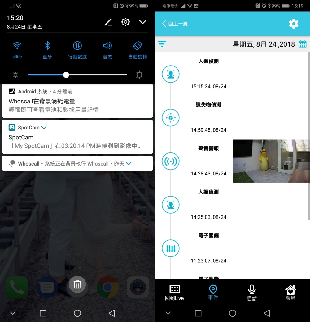 不論是哪一項設定,當觸發條件後都會在手機上跳出通知,並且可以在事件區裡看到觸發了哪一個項目,點擊後就可以馬上查看該事件的錄影回放,就可以立刻知道當下的影像狀況囉。