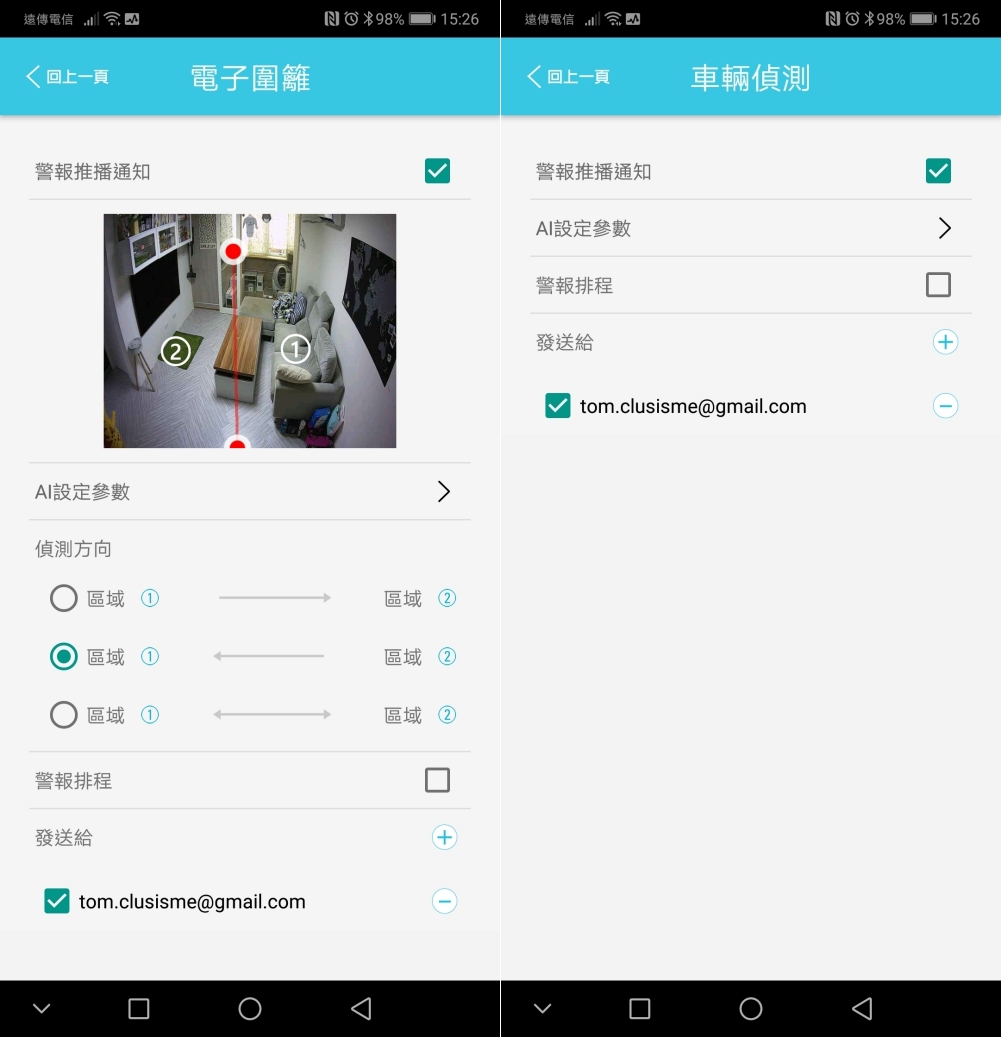 車輛偵測則是針對畫面範圍車子的進入,觸發事件進行通知,比如你家門口是不讓人停車的話,只要開啟該選項,當有人停在你家門口時就會馬上通知,這時其實你就可以遠端報警來拖走了..XDDDD