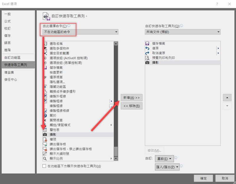 這個功能應該可以算是超隱藏的,以前阿湯真的不知道,我們要先把它找出來,進入 Excel 選項自訂快速存取工具列,選擇不在功能區的命令,往下拉找到「攝影」,再按新增。